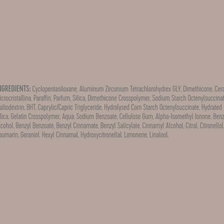 Cyclopentasiloxane, Aluminum Zirconium Tetrachlorohydrex GLY, Dimethicone, Cera Microcristallina, Paraffin, Parfum, Silica, Dimethicone Crosspolymer, Sodium Starch Octenylsuccinate, Maltodextrin, BHT, Caprylic/Capric Triglyceride, Hydrolysed Corn Starch Octenylsuccinate, Hydrated Silica, Gelatin Crosspolymer, Aqua, Sodium Benzoate, Cellulose Gum, Alpha-Isomethyl Ionone, Benzyl Alcohol, Benzyl Benzoate, Benzyl Cinnamate, Benzyl Salicylate, Cinnamyl Alcohol, Citral, Citronellol, Coumarin, Geraniol, Hexyl Cinnamal, Hydroxycitronellal, Limonene, Linalool.