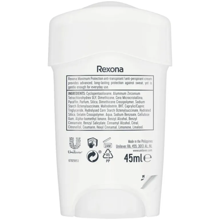 Rexona Women Maximum Protection Clean Scent Anti-Transpirant Stick is speciaal ontwikkeld om drie keer zoveel bescherming te bieden dan onze reguliere anti-transpirant. Dankzij de langwerkende formule ben je tot 96 uur lang beschermd tegen overmatige transpiratie en lichaamsgeur. Maximum Protection bevat de Defence+ Technologie. Dit krachtige actieve bestanddeel kan het beste aangebracht worden voor het slapengaan. Op dit moment zijn je zweetklieren minder actief waardoor de formule kan reageren op de stoffen in je lichaam. Op deze manier ben je de volgende dag maximaal beschermd. De actieve bestanddelen van de Defence+ Technologie gaan de vorming van nieuw zweet tegen doordat ze een dikke beschermlaag over je zweetklieren leggen. Zo bestrijdt de anti-transpirant de vorming van nare geuren en overmatige transpiratie. De anti-transpirant biedt dus drie keer zo veel bescherming dan onze reguliere anti-transpirant, waardoor jij je dag vol zelfvertrouwen tegemoet gaat. De Rexona Maximum Protection Anti-Transpirant is verkrijgbaar in de vorm van een stick, zodat het gemakkelijk is aan te brengen en bevat een frisse geur. Naast de Defence+ Technologie bevat de crème zeer effectieve hydraterende bestanddelen die ervoor zorgen dat het een zachte deodorant is voor dagelijks gebruik. Voel je fris en schoon de hele dag door. Wil je lang genieten van droge en frisse oksels? Dan kun je op Rexona vertrouwen. Maximum Protection anti-transpirant gaat namelijk niet alleen nare geurtjes tegen, maar ook transpiratievocht. Zo ga jij weer vol zelfvertrouwen de deur uit! Rexona. Blijf fris wat je ook doet.