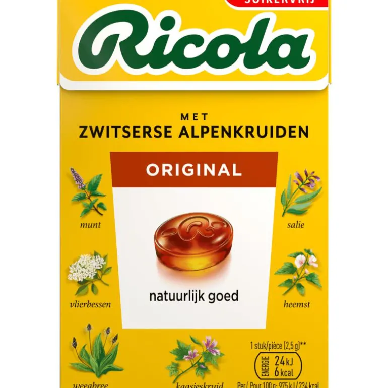 De Ricola Original Suikervrije kruidenpastilles bevatten alle goede eigenschappen van een traditionele mix van 13 Ricola kruiden van hoogwaardige kwaliteit. Deze combinatie werkt verzachtend en verzorgend voor de keel.