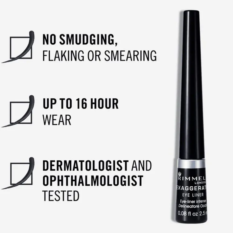 Het dunne kwastje zorgt voor ultieme controle waardoor je keer op keer het meest nauwkeurige lijntje zet. De veegvaste en vloeibare formule blijft tot wel 16 uur perfect zitten en is intens zwart van kleur. Of je nou een subtiele eyeliner look creert of een bold statement wil maken met een verleidelijke cat-eye wing, de Rimmel Exaggerate maakt het allemaal mogelijk!