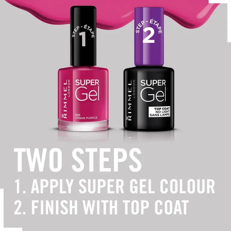 Rimmel London introduceert haar nieuwe Super Gel nagellak voor de meest langdurige London look ooit! Lak je nagels met de ongelofelijke kleuren met ingebouwde base coat en lak ze daarna met deze zelf-herstellende topcoat voor de perfecte gel manicure. Zeg JA tegen een verzorgde salon manicure en nee tegen UV lampen, uren in een salon en een lege portemonnee.