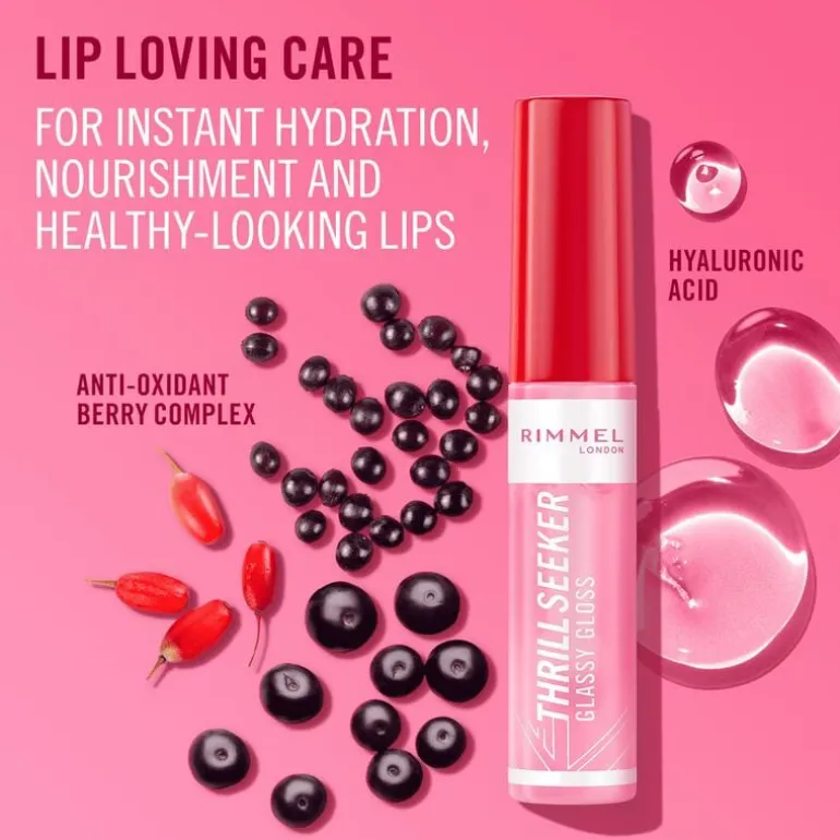 Rimmel London Thrill Seeker Glassy Gloss zorgt onmiddellijk voor voller uitziende lippen met ´glassy´ glans. De vegan formule van dit product is rijk aan hyaluronzuur en bevat een antioxidantencomplex dat de lippen intens hydrateert en voedt, zodat ze er weer mooi gezond uitzien. Deze hydraterende gloss van Rimmel is voorzien van een handige donzige ‘doe foot’ applicator, waarmee je de juiste hoeveelheid lipgloss perfect gelijkmatig over je lippen verdeelt.