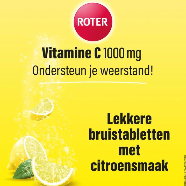 Roter 1000 mg vitamine C Bruis zijn bruistabletten. Het vitamine C bruistablet oplossen in een glas water en direct opdrinken. Aanbevolen dosering is 1 bruistablet per dag. Houd je aan de aanbevolen dosering. Voedingssupplementen in de vorm van extra vitamine C zijn geen vervanging van je dagelijkse voeding.