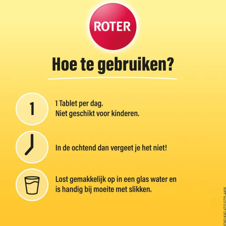 Dosering: 1 tablet per dag. Tablet oplossen in een glas water (200 ml) en direct opdrinken.