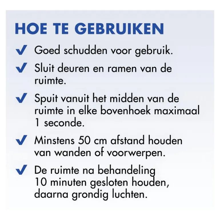 Gebruiksaanwijzing: Sluit eerst deuren en ramen van de te behandelen ruimte. Spuit vanuit het midden van de ruimte in elke bovenhoek niet langer dan 1 seconde. De ruimte na behandeling 10 minuten gesloten houden,daarna grondig luchten. De werkzame stof wordt fijn door de ruimte verdeeld en blijft in de lucht zweven. Insecten vliegen er doorheen en ademen de stof in.