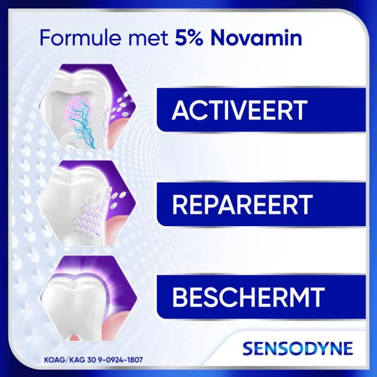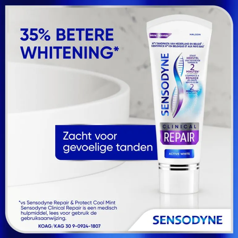 Start herstel van gevoelige tanden in 2 minuten* met Sensodyne Clinical Repair Active white. De formule met 5% Novamin vormt een beschermde laag over de gevoelige gedeeltes van de tand en beschermt zo tegen gevoeligheid**. Sensodyne Clinical Repair Active white is een dagelijkse fluoride tandpasta voor gevoelige tanden met rijk schuimende gel textuur en frisse muntsmaak. De tandpasta biedt 35% betere whitening*** en de verpakking is recyclebaar. Sensodyne is de N˚1 tandpasta van Nederland en België****.