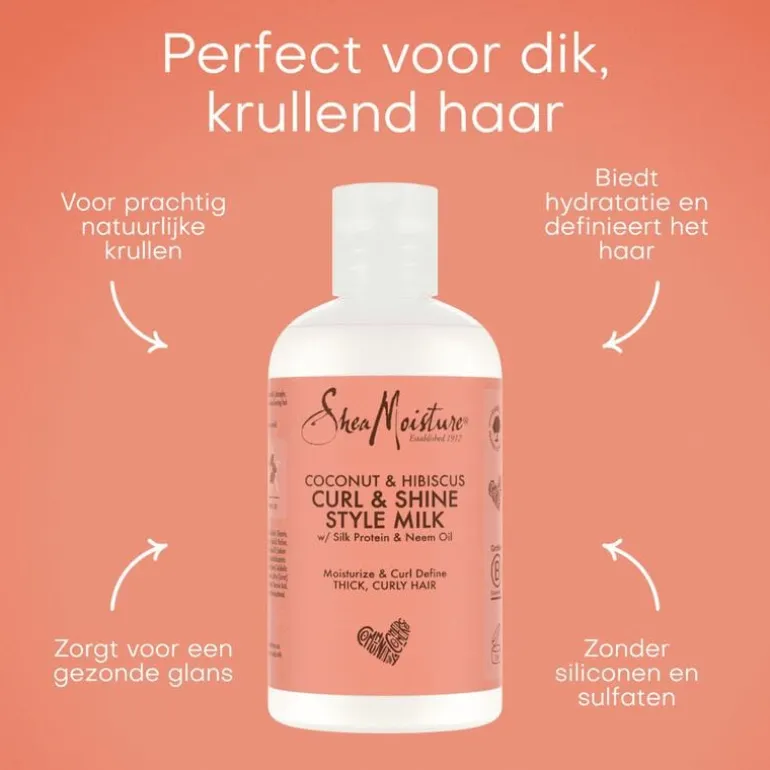 SheaMoisture Coconut & Hibiscus Curl & Shine Style Milk voor dik, krullend haar hydrateert en definieert het haar voor veerkrachtige en gezonde krullen.