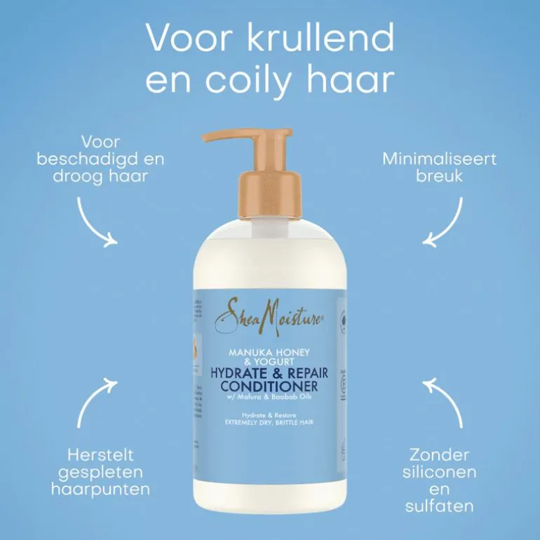SheaMoisture Manuka Honey & Yoghurt Hydrate & Repair Conditioner herstelt droog en beschadigd haar. De conditioner helpt beschadigd haar en gespleten haarpunten te herstellen, waardoor je haar weer gezonder aanvoelt. De herstellende conditioner vermindert haarbreuk op warmte-gestyled haar met 76% wanneer gebruikt met onze Hydrate & Repair Shampoo*. Wanneer je deze conditioner regelmatig gebruikt, wordt je haar veerkrachtiger, sterker en gaat het weer glanzen. De SheaMoisture Manuka Honey & Yoghurt Hydrate & Repair Conditioner is verrijkt met een voedende mix van manukahoning, yoghurt, natuurlijke sheaboter en mafura- en baobabolie. Dit product is geschikt voor dagelijks gebruik, bevat geen siliconen en sulfaten en is ook geschikt voor gekleurd haar. *Getest op niet-chemisch behandeld haar.