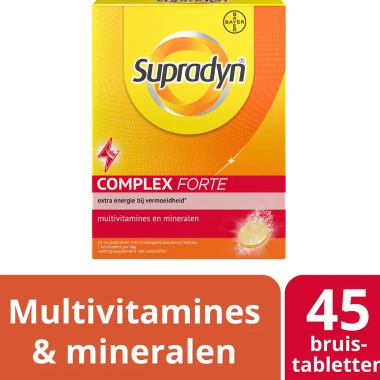 Sta actief in het leven! Supradyn Complex Forte geeft je als aanvulling op de voeding een steuntje in de rug tijdens veeleisende periodes waarin je de extra energie bij vermoeidheid goed kunt gebruiken**, zoals drukte op je werk, als je weerstand op de proef wordt gesteld, de combinatie werk/gezin. Neem als aanvulling op je dagelijkse voeding een hoog gedoseerde tablet van Supradyn Complex Forte. ; *De vitamines B2, B3, B5, B6, B12, C, het mineraal magnesium en het sporenelement ijzer activeren extra energie bij vermoeidheid. ; **Multiscope marktpeiler 2016 ; ***Vergeleken met Supradyn Complex Energy; ruim onder de maximaal veilige hoeveelheid.