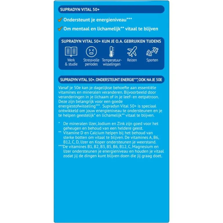 Supradyn Vital 50+ bevat een combinatie van vitamines die voorzien in de veranderende behoefte van je lichaam vanaf 50 jaar. De vitamines B1, B2, B3, B5, B6, B8, B12, C, het mineraal magnesium en het sporenelement ijzer ondersteunen je energieniveau en houden je vitaal. De mineralen ijzer, jodium en zink zijn goed voor het geheugen en behoud van een heldere geest. ; Essentiële vitamines en mineralen spelen een belangrijke rol bij de energiestofwisseling. Supradyn Vital 50+ ondersteunt je energieniveau* en helpt je om geestelijk** en lichamelijk* vitaal te blijven. *De vitamines B1, B2, B3, B5, B6, B8, B12, C, het mineraal magnesium en het sporenelement ijzer ondersteunen je energieniveau en houden je vitaal zodat je de dingen kunt blijven doen die je graag doet. ; **De mineralen ijzer, jodium en zink zijn goed voor het geheugen en behoud van een heldere geest.