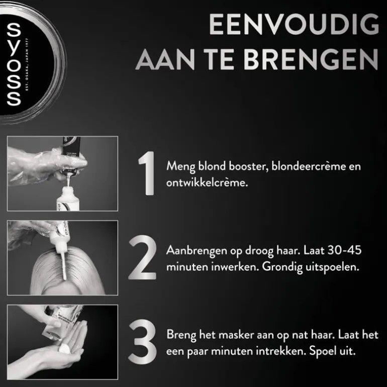 *Stap 3: Uitspoelen. Spoel het haar na de inwerktijd goed uit met lauw tot warm water tot het water helder is. Breng vervolgens de meegeleverde Syoss Oleo Conditioner op het natte haar aan. Laat de conditioner 2 minuten inwerken en spoel daarna vervolgens grondig uit.