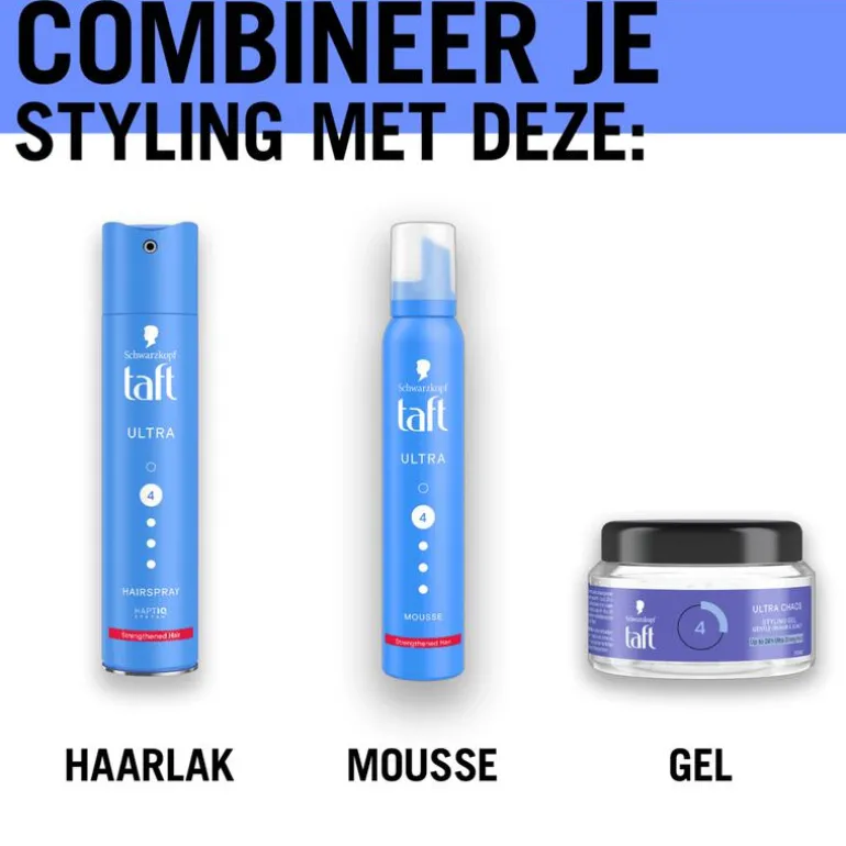 Taft Ultra Chaos Styling Gel voor chaotische en warrige kapsels. Het geeft je haar tot 24 uur ultra sterke hold, plakt niet en is makkelijk uit te wassen. Deze gel is zacht voor haar en hoofdhuid en bevat hydraterende panthenol. De gel is vrij van alcohol (ethylalcohol). Alle Taft formules zijn vegan* en PETA gecertificeerd**.