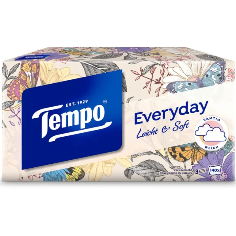 Tempo 3-in-1 zakdoeken: fluweelzacht, wasmachinebestendig en biologisch afbreekbaar. Recyclebare tissuedoos gemaakt van gerecycled papier.
