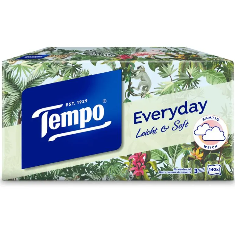 Zorg goed voor jezelf, je dierbaren en de planeet met Tempo 3-in-1 zakdoekjes. Omdat je er bij een niesbui, verkoudheid of ongelukje op kunt vertrouwen. Tempo is dermatologisch getest, is zacht voor zelfs de meest gevoelige huid en daarom zo fijn om in de buurt te hebben voor elke situatie. Per ongeluk een zakdoekje in de wasmachine gegooid? Deze zachte en sterke zakdoekjes doorstaan een wasje in de wasmachine waardoor je je geen zorgen hoeft te maken als een zakdoekje per ongeluk in de was belandt. Bij Tempo zijn we continue bezig om onze impact op het milieu te verminderen. Al onze zakdoekjes zijn gemaakt van verantwoord gewonnen FSC-gecertificeerde vezels en onze zakdoekjes zijn biologisch afbreekbaar. Onze biologisch afbreekbare tissues zijn hygiënisch en gemakkelijk weg te gooien met die Tempo-kwaliteit die je kent en waardeert. De recyclebare Tempo tissueboxen zijn ook gemaakt van minimaal 70% gerecycled papier, met een papieren in plaats van plastic opening. Met een trendy design en een Quick&Easy opening zijn Tempo tissueboxen altijd bij de hand wanneer je ze nodig hebt.