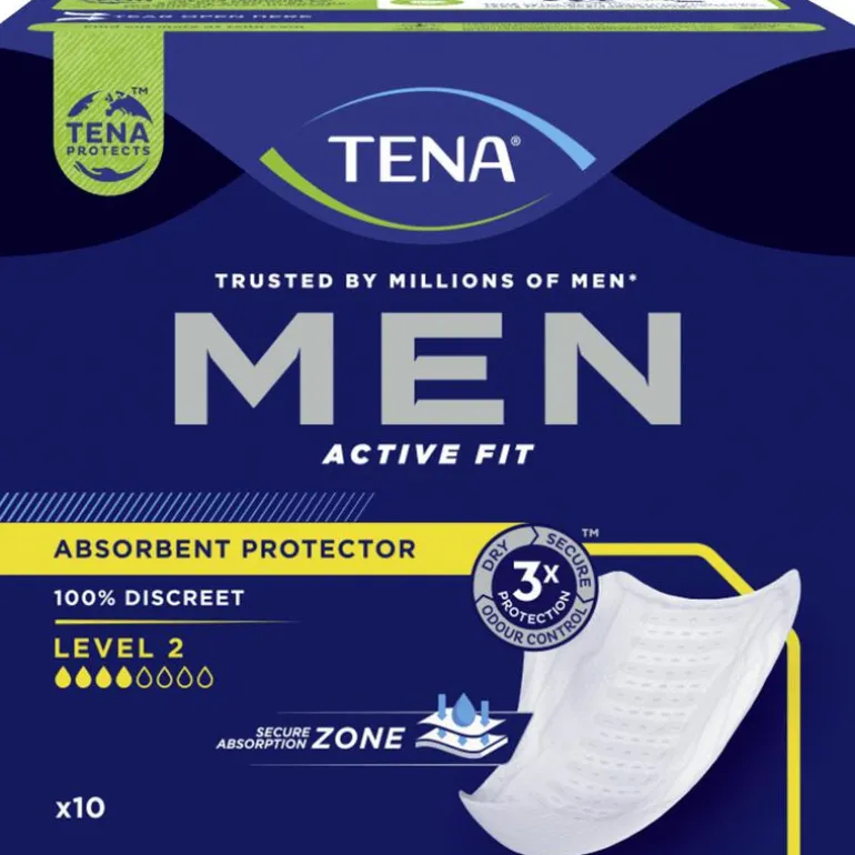 TENA MEN ACTIVE FIT LEVEL 2 biedt DISCRETE, BETROUWBARE BESCHERMING tegen MATIG URINEVERLIES. Profiteer van DRIEVOUDIGE BESCHERMING tegen urineverlies, geurtjes en vocht. Dit verband is speciaal ontwikkeld voor mannen en heeft een MANNELIJKE CUPVORM.Met de SECURE ABSORPTION ZONE biedt het verband BETROUWBARE BESCHERMING en absorbeert het snel. Het is slechts 4 MM DUN, comfortabel en discreet, zodat u het bijna niet merkt. Het verband is eenvoudig te gebruiken: plak het in uw ondergoed met de PRAKTISCHE PLAKSTRIP en u kunt het de hele dag dragen zonder zorgen.Het is compact verpakt, zodat u het discreet kunt opbergen in uw SPORTTAS of WERKTAS. Blijf de hele dag ZELFVERZEKERD en ONDER CONTROLE.