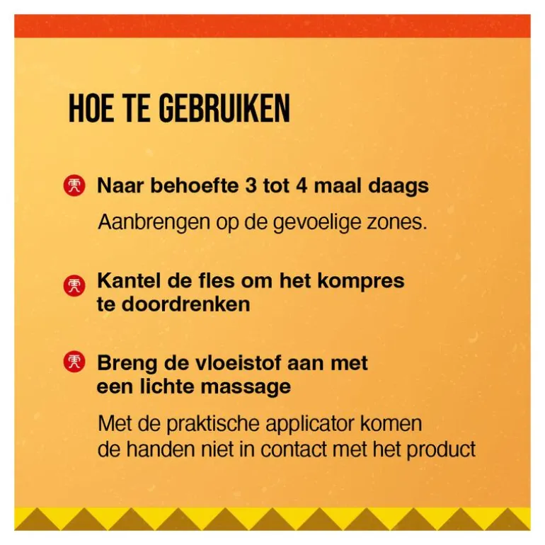 Naar behoefte 3 tot 4 keer per dag aanbrengen op de gevoelige zones. Kantel de fles om het kompres te doordrenken. Breng de vloeistof aan met een lichte massage.