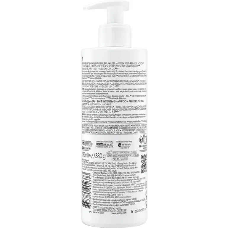 Vichy Dercos Technique 2-in-1 Anti-roos Shampoo + Conditioner combineert een anti-roos en anti-jeuk werking met een hydraterende verzorging die het haar helpt te ontwarren. Het is zowel een verzorgende shampoo als een ontwarrende conditioner die de hoofdhuid zacht en glanzend maakt. Het bevat seleniumdisulfide, een actief ingrediënt dat van bij het eerste gebruik roos verwijdert en terugkeer voorkomt. Het microbioom wordt terug in evenwicht gebracht, waardoor het probleem bij de bron wordt aangepakt. Hyaluronzuur zorgt voor een diepe hydratatie. Het haar is zachter en gemakkelijker te ontwarren.