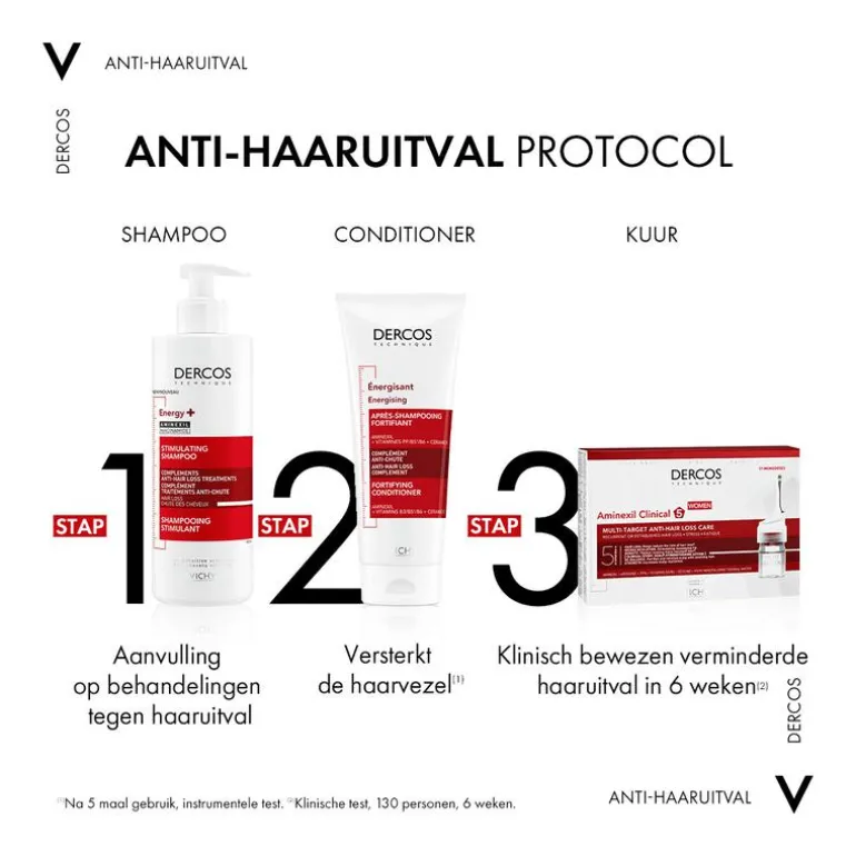 De Energy + Shampoo van Vichy Dercos Technique is ontworpen voor mannen en vrouwen die kampen met lichte tot vergevorderde haaruitval. Het is de enige shampoo met Aminexil van Vichy, een van de voornaamste cosmetische moleculen in de strijd tegen haaruitval. De effecten van deze shampoo zijn klinisch bewezen in 2 studies.