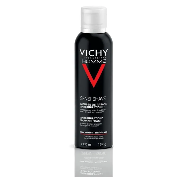 Vichy Homme Anti-Irritatie Scheerschuim is speciaal ontwikkeld om ingegroeide haartjes, roodheid en puistjes bij mannen met een gevoelige huid te voorkomen. De combinatie van calcium, geglycoliseerde vitamine C en salicylzuur voorkomt verhitting van de huid na het scheren.
