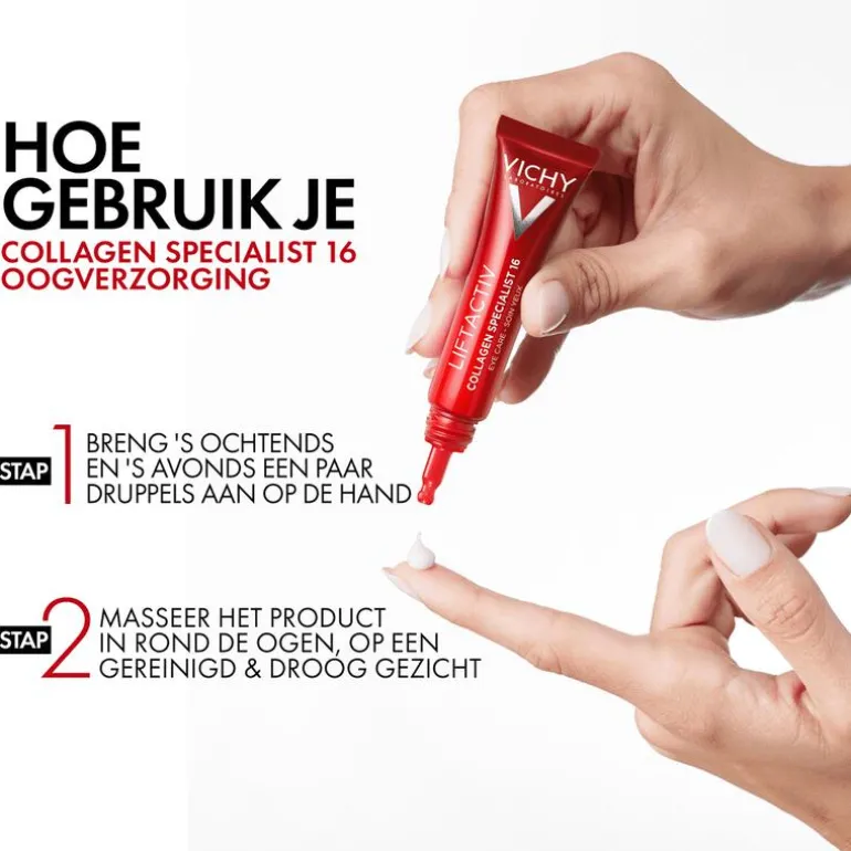 Naarmate we ouder worden begint de collageenproductie af te nemen, wat de tekenen van huidveroudering versnelt, vooral rondom de ogen. De experten van Vichy hebben de Liftactiv Collagen Specialist 16 Oogverzorging ontworpen om de 16 tekenen van huidveroudering* te bestrijden met behulp van de unieke Co-Bonding Technologie: wallen, donkere kringen, rimpels onder de ogen, kraaienpootjes, fijne lijntjes, stevigheid, verslapping, soepelheid, huidtextuur, tekenen van vermoeidheid, toniciteit, veerkracht, glans, elasticiteit, hydratatie, uniformiteit.