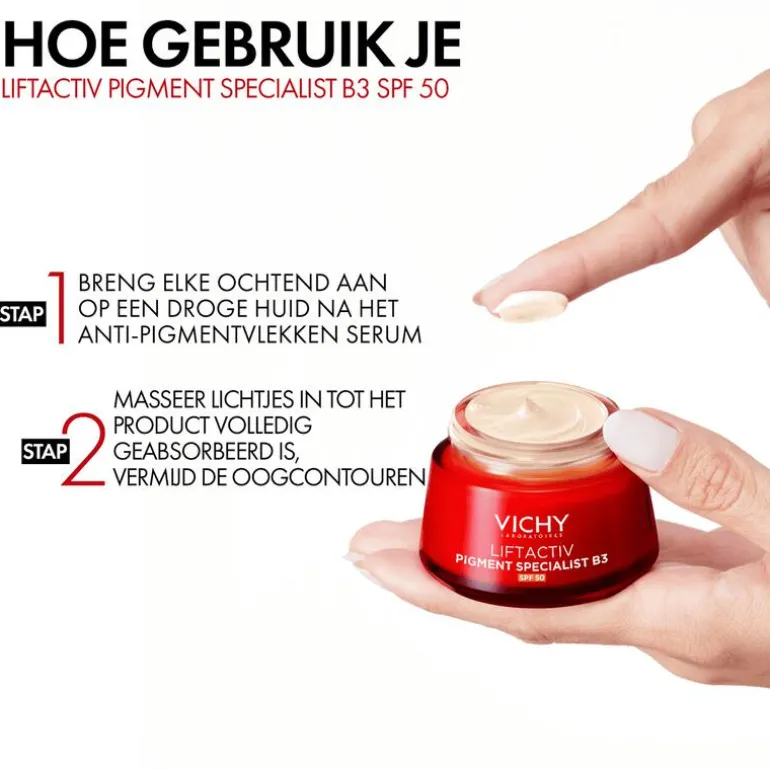 De nieuwe Liftactiv B3 Dagcrème SPF50 tegen rimpels en pigmentvlekken werkt dankzij een anti-pigmentvlekken samenstelling en een zeer hoge SPF50 bescherming. Deze crème wordt aanbeloven voor vrouwen die op zoek zijn naar een anti-aging resultaat dat de vorming van pigmentvlekken en rimpels helpt te voorkomen en dat de reeds bestaande pigmentvlekken minder zichtbaar maakt dankzij een zeer hoge SPF50 bescherming.