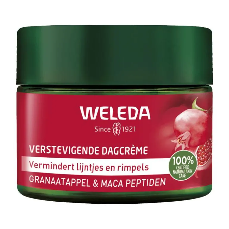 Weleda Verstevigende Dagcrème is 100% natuurlijke verzorging voor de 40+ huid. Verstevigende Dagcrème met biologische granaatappelolie en peptiden van macawortel beschermt tegen vrije radicalen en blauw licht en verbetert de elasticiteit en spankracht van je huid. De crème trekt snel in en is goed verdraagzaam.