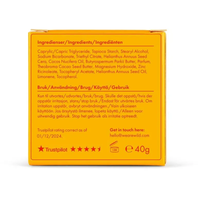 Tapioca Starch, Baking Soda, Sunflower Seed Wax, Cocoa Seed Butter, Tocopherol Acetate, Capric Glycerides, Coconut Oil, Stearyl Alcohol, Triethyl Citrate, Sunflower Seed Oil, Shea Butter, Magnesium Hydroxide, Zinc Ricinoleate, plus fragrance.