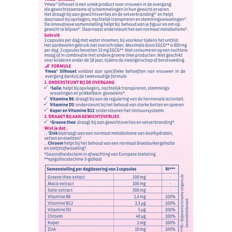 Ymea Silhouet is een fytoproduct. Dit betekent dat de hoofdingrediënten plantenextracten zijn, die niet worden verdund.