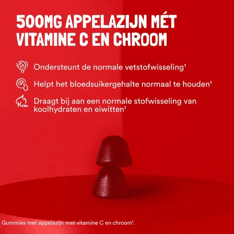 Krijg dagelijks maar liefst 500mg appelazijn binnen met onze gummie. Bevat ook Chroom en Vitamine C. Vitamine C heeft een gunstige invloed op een normaal energieleverend metabolisme.