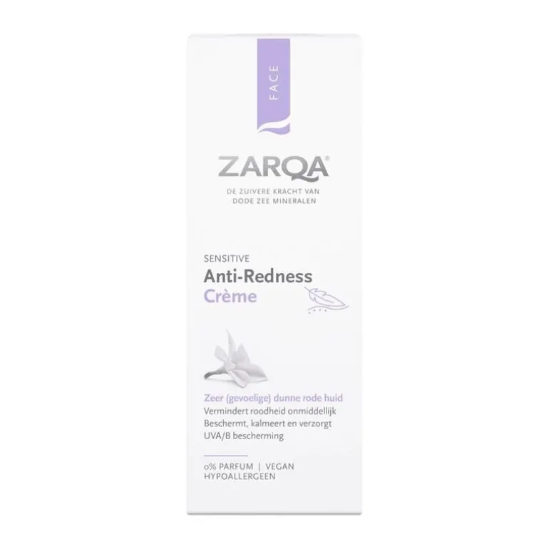 Zarqa Anti-Redness Crème is een milde maar zeer effectieve crème die de huid kalmeert en roodheid – bijvoorbeeld op wangen en neus – vermindert. De huidbarrière wordt versterkt en de huid zal op langere termijn soepeler en steviger aanvoelen. Zarqa Anti-Redness Crème gaat rode vlekjes tegen, vermindert gevoeligheden en beschermt de huid tegen schadelijke invloeden van buitenaf, waaronder luchtvervuiling en UVA- en UVB-stralen. De crème werkt ook verstevigend, dankzij het natuurlijke anti-age complex Sepilift™. Geschikt voor alle huidtypen, in het bijzonder voor de dunne, gevoelige huid.