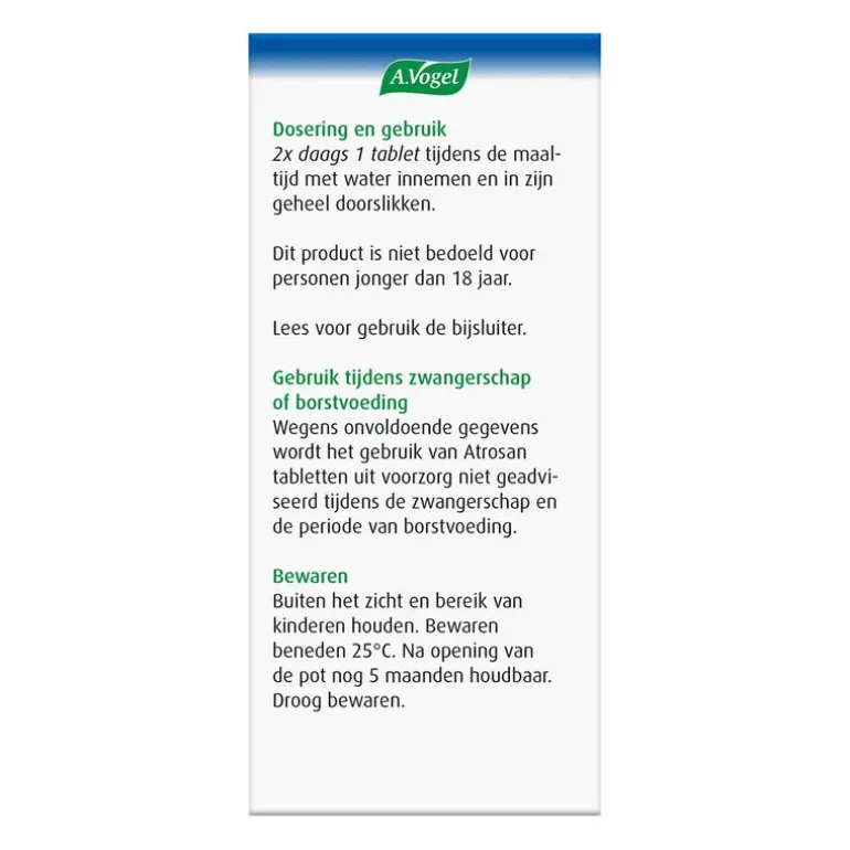 Ons advies is Atrosan tabletten minimaal 4 weken achtereen te gebruiken, maar ze kunnen gerust langdurig gebruikt worden. De tabletten kunnen naast reguliere medicijnen gebruikt worden. Overleg eerst met je arts.
