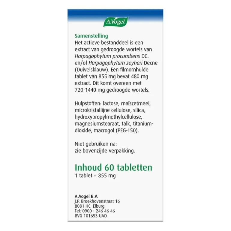 Samenstelling: Extract van gedroogde wortels van de duivelsklauw (Harpagophytum procumbens DC. en/of Harpagophytum zeyheri Decne). Een filmomhulde tablet van 855 mg bevat 480 mg extract. Dit komt overeen met 720-1440 mg gedroogde wortels.