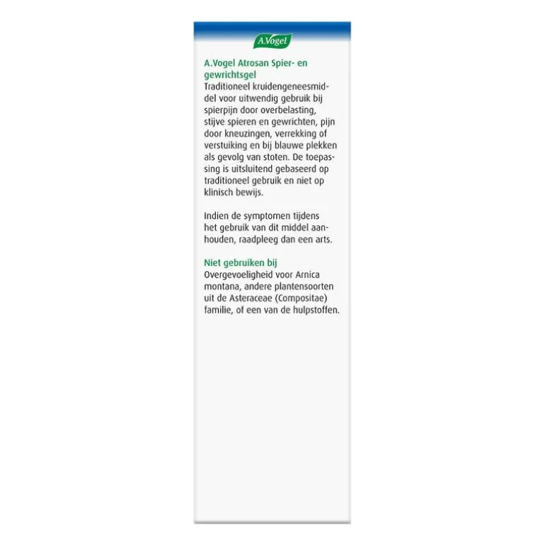 Atrosan Spier- en Gewrichtsgel bevat een hoge concentratie Arnica montana (50%). Ook wel valkruid genoemd. Van oudsher staat deze plant bekend om haar werking bij pijnlijke spieren en stijve gewrichten, stijfheid, kneuzingen, verrekkingen, verstuikingen en blauwe plekken. De Arnica in ons product wordt geoogst in de Zuid-Duitse bergen. Na het oogsten worden de planten direct verwerkt tot Arnica-extract, zodat de werkstoffen uit de planten optimaal behouden blijven.
