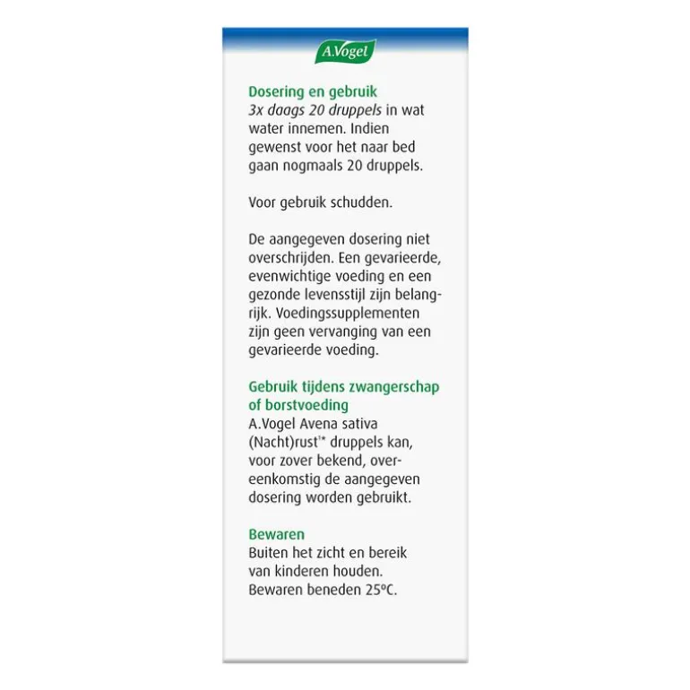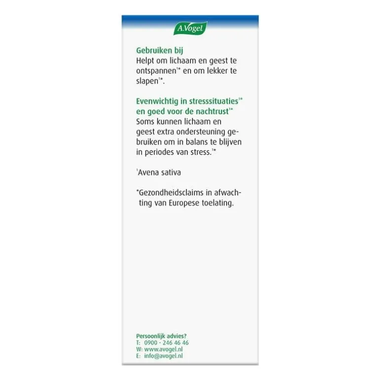 Soms kunnen lichaam en geest extra ondersteuning gebruiken om in balans te blijven in periodes van stress1*. A.Vogel Avena sativa (Nacht)rust1* druppels bevat Avena sativa, dat helpt om lichaam en geest te ontspannen*. Het helpt ook om lekker te slapen*.