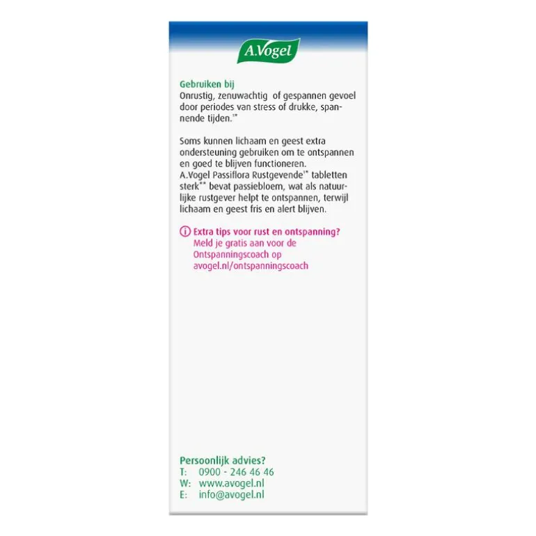 Niet altijd is het mogelijk om de oorzaak van je stress of spanning weg te nemen. Passiflora Rustgevende1* tabletten sterk** kan je dan helpen om er rustiger mee om te gaan1*. Het helpt snel***, maar houdt je lichaam en geest wel fris en alert. Goed om te weten is dat Passiflora Rustgevende1* tabletten sterk** geen gewenning geeft; je kunt op elk gewenst moment stoppen.