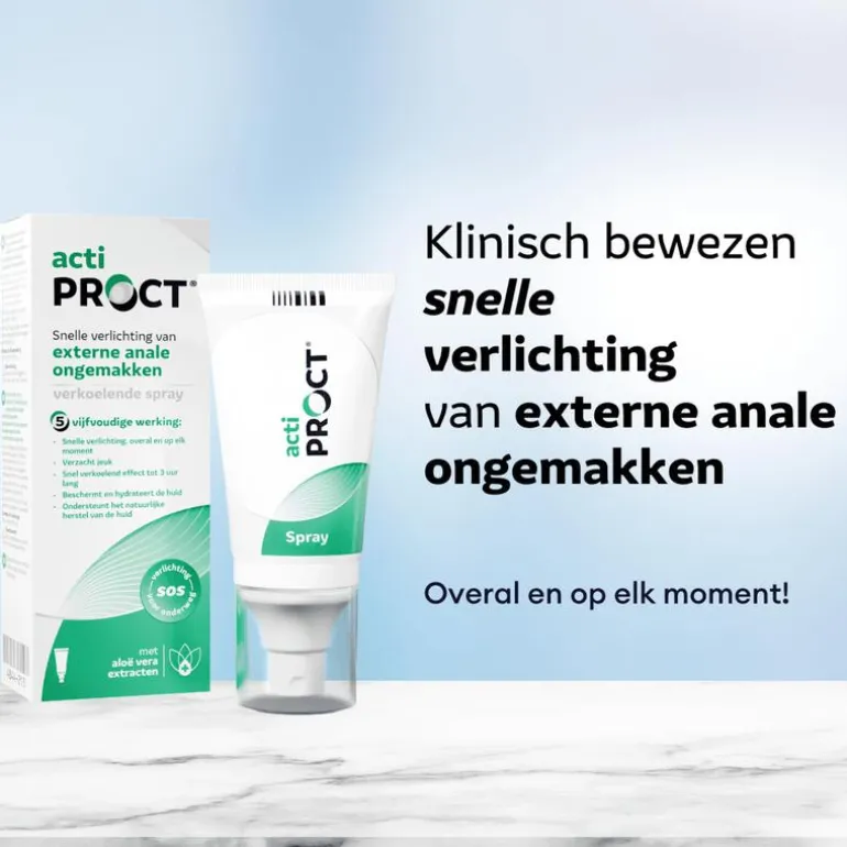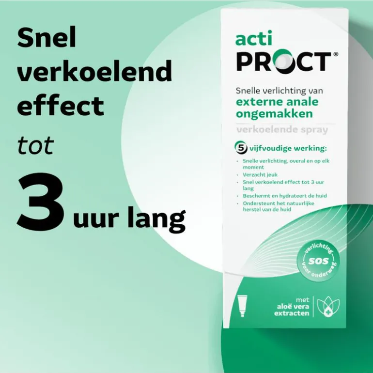 5 vijfvoudige werking: – Snelle verlichting, overal en op elk moment. – Verzacht jeuk. – Snel verkoelend effect tot 3 uur lang. – Beschermt en hydrateert de huid. – Ondersteunt het natuurlijke herstel van de huid. De formule van ActiProct® Spray is uniek door zijnverkoelende, verzachtende en jeukstillende werking bij uitwendige anale ongemakken. Met het natuurlijke 2QR-complex van natuurlijke aloë vera zorgt het voor een snel verkoelend effect (tot 3 uur) en een snelle verlichting van uitwendige anale ongemakken.