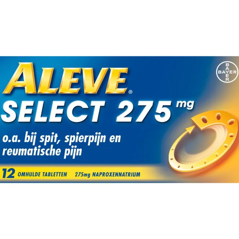 Je wilt van je pijn af om te blijven doen wat je graag wilt doen. Aleve werkt tot wel 12 uur lang, hierdoor hoef je niet zo vaak een tablet in te nemen per dag. Aleve Select is een effectieve pijnstiller met een langdurige werking, 1 pil werkt tot wel 12 uur lang. Overdag en tijdens het slapen. Aleve Select verlicht effectief rugpijn, maar is ook geschikt voor andere pijnen die wat langer kunnen aanhouden. Zoals bijvoorbeeld spierpijn en gewrichtspijn. Aleve Select heeft een tweeledige werking: Het werkt pijnstillend en óók ontstekingsremmend. Aleve Select is effectief en geschikt bij onder andere rugpijn omdat Aleve Select langdurig werkt. Rugpijn is namelijk een pijnsoort die ook vaak wat langer aanhoudt. Bij spierpijn kunnen warmtepleisters in combinatie met een pijnstiller een oplossing zijn. Warmtepleisters kunnen helpen om de spieren te ontspannen door middel van warmte. Aleve Select kan helpen bij verlichting van de pijn door de stof in het lichaam die de zenuwen prikkelt om een pijnsignaal af te geven, te remmen.Tip: Blijf bewegen. Het is belangrijk om in beweging te blijven zodat je lichaam soepel blijft. Pijnstillers helpen bij rugklachten of nekklachten tegen de pijn, waardoor het bewegen minder pijnlijk is.Aleve Select 275 mg, naproxennatrium: niet te gebruiken bij maag-, darm- en andere bloedingen, maagpijn, gelijktijdig gebruik van antistollingsmiddelen, ernstig hartfalen en wanneer u in de laatste 3 maanden van uw zwangerschap bent.