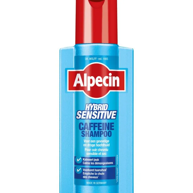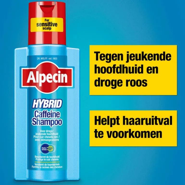 De cafeïne shampoo die je gebruikt bij een gevoelige of jeukende hoofdhuid. De Hybride technologie is mild en krachtig tegelijk. Het hydrateert en kalmeert de hoofdhuid en de voedende cafeïne vertraagt erfelijk bepaalde haaruitval. Zeer geschikt bij droge roos. Hydraterend effect: Een milde shampoo-formule speciaal voor de gevoelige of jeukende huid. Hydrateert en kalmeert de hoofdhuid.Voedend effect: De krachtige werkzame stof cafeïne dringt tot diep in de haarwortels door. Haren worden langer vastgehouden, waardoor de haaruitval aanzienlijk vertraagt.Ruim 1 op 4 mannen heeft een gevoelige hoofdhuid. Ze hebben last van jeuk, droge rode huid en een trekkerig gevoel afhankelijk van de individuele aanleg reageert de hoofdhuid bijzonder gevoelig. Jeuk is een kenmerkend probleem van de droge, gevoelige hoofdhuid.De oorzaak kan een onderproductie van de talgklieren zijn, hierdoor raakt de hoofdhuid uit haar natuurlijke evenwicht. Een droge, gevoelige hoofdhuid is het gevolg.Speciaal daarvoor werd Alpecin Hybrid Cafeïne -Shampoo ontwikkeld. De shampoo zorgt voor een milde reiniging van het haar en hydrateert en kalmeert de hoofdhuid. De brandstof cafeïne dringt tot in de hoofdhuid door, versterkt de haarwortels en voorkomt bij dagelijks gebruik erfelijk bepaalde haaruitval.Opgelet: Een droge hoofdhuid heeft vaker last van fijne, witte schilfers. Dit moet niet verward worden met vette hoofdroos. De droge hoofdhuid moet dan ook met milde producten zoals Alpecin Hybrid Cafeïne-Shampoo behandeld worden.