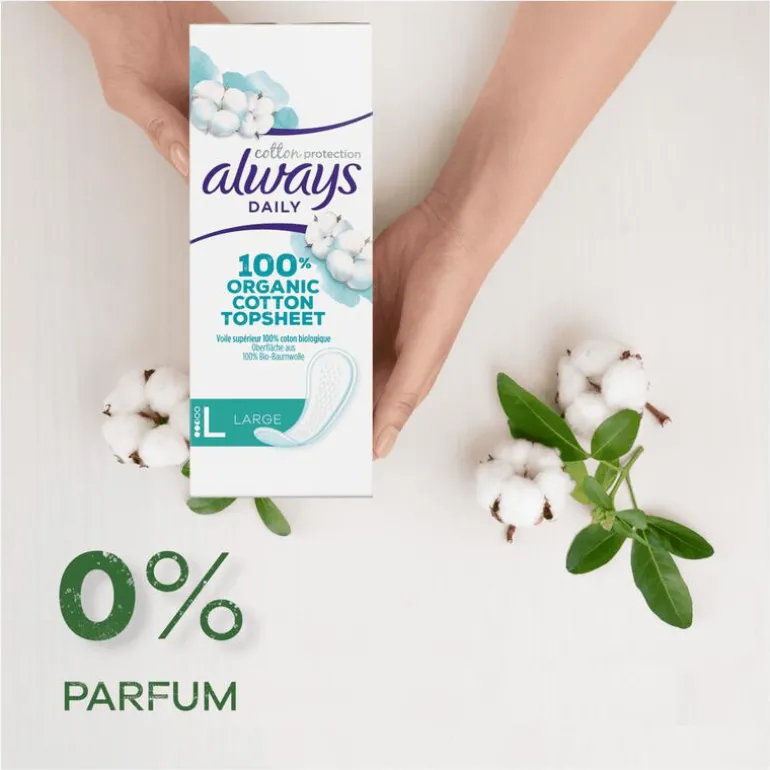 Always Dailies biedt betrouwbare bescherming met een bovenlaagje van 100% biologisch katoen