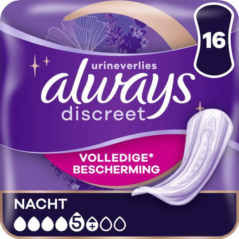 Always Discreet Nacht verbanden voor urineverlies bieden je volledige* bescherming en optimale discretie, zelfs tijdens de nacht.