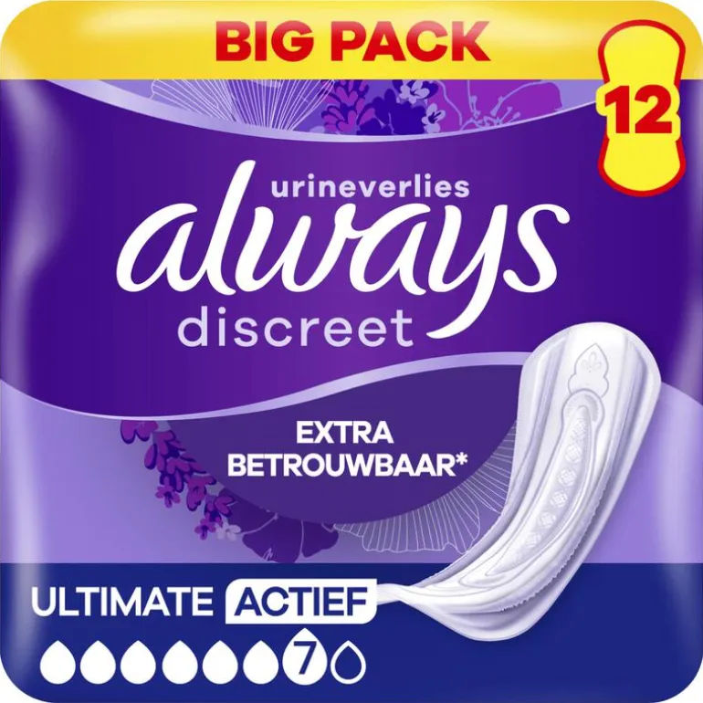 Ons meest absorberend verband in het assortiment, ideaal voor zorgeloze dagen. Always Discreet verband voor urineverlies Ultimate Actief biedt extra zekerheid. Ze zijn ontworpen om je extra bescherming en absorptie te bieden, zodat je je geen zorgen hoeft te maken over lekken. Hun structuur zorgt voor optimale bescherming dankzij hun ultradunne kern, zodat je niet hoeft te kiezen tussen comfort en bescherming. Always Discreet verband Ultimate Actief biedt optimale bescherming wanneer niezen of lachen urineverlies veroorzaakt.