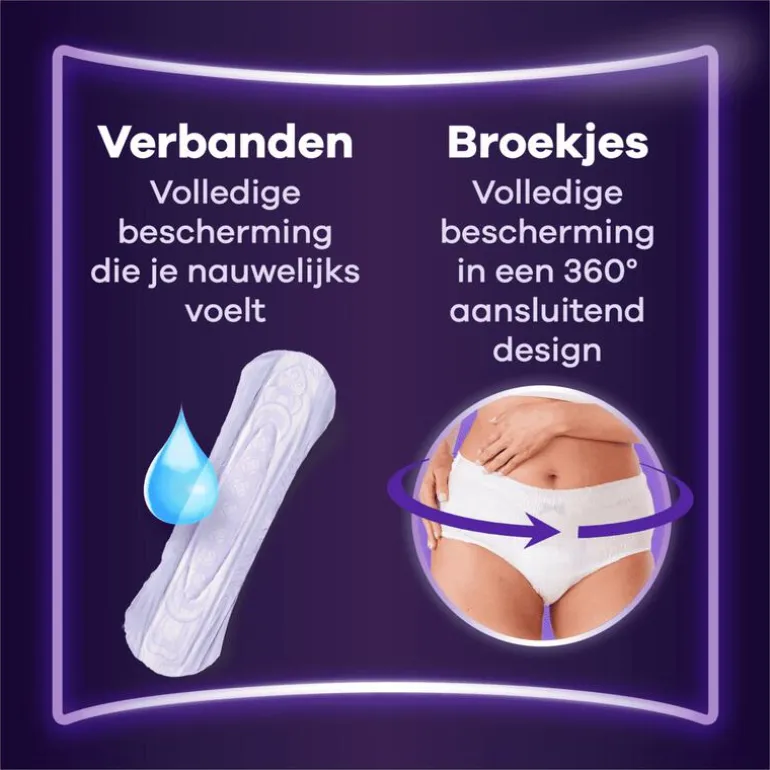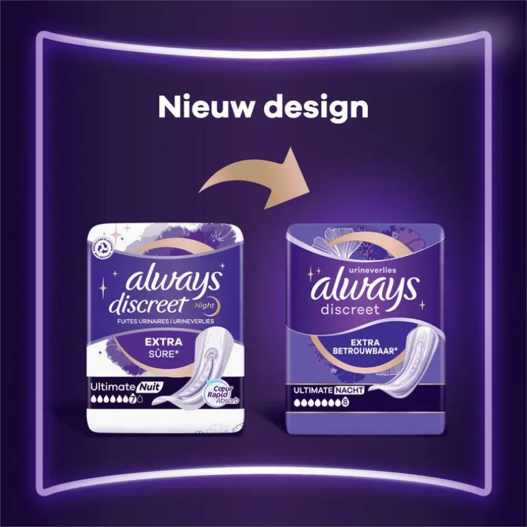 Ons meest absorberend verband in het assortiment, ideaal voor zorgeloze nachten. Always Discreet verband voor urineverlies Ultimate Nacht biedt extra zekerheid. Ze zijn ontworpen om je extra bescherming en absorptie te bieden, zodat je je geen zorgen hoeft te maken over lekken. Hun structuur zorgt voor optimale bescherming dankzij hun ultradunne kern, zodat je niet hoeft te kiezen tussen comfort en bescherming. Always Discreet verband Ultimate Nacht biedt optimale bescherming wanneer niezen of lachen urineverlies veroorzaakt.