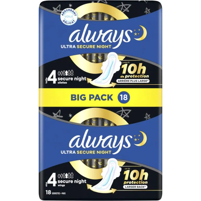 Geniet van een goede nachtrust en zeg ja tegen tot 10 uur lang bescherming: Always Ultra Secure Night maandverbanden (maat 4) met vleugels en een zacht aanvoelende absorberende toplaag hebben 3 beschermingskenmerken zodat je ’s nachts niet hoeft op te staan om te controleren of je maandverband lekt of om het te vervangen.