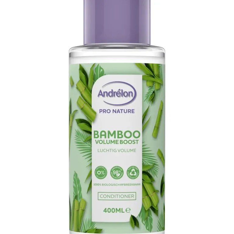 ANDRÉLON PRO NATURE BAMBOO VOLUME BOOST CONDITIONER, VERRIJKT MET BAMBOE, HYDRATEERT FUTLOOS HAAR EN GEEFT LUCHTIG VOLUME MET EEN PRACHTIGE NATUURLIJKE GLANS.• Andrélon Pro Nature Bamboo Volume Boost Conditioner hydrateert intensief• De conditioner bevat geen sulfaten en siliconen is verrijkt met bamboe• Geeft futloos haar luchtig volume met een prachtige natuurlijke glans• De Bamboo Volume Boost Conditioner is 100% biologisch afbreekbaar• Conditioner gemaakt met 98% ingrediënten van natuurlijke oorsprong*• De fles van deze conditioner is recyclebaar en is 100% gerecycled** plastic