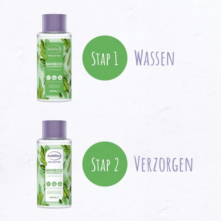 Gebruik voor een optimaal resultaat en voeding van je haar ook de Andrélon Pro Nature Bamboo Volume Boost Shampoo. Hoe het werkt? Knijp, verdeel over de lengte van je haar, laat even inwerken en spoel het uit.