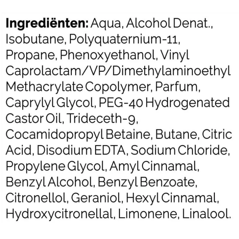 Aqua, Alcohol Denat., Isobutane, Polyquaternium-11, Propane, Phenoxyethanol, Vinyl Caprolactam/VP/Dimethylaminoethyl Methacrylate Copolymer, Parfum, Caprylyl Glycol, PEG-40 Hydrogenated Castor Oil, Trideceth-9, Cocamidopropyl Betaine, Butane, Citric Acid, Disodium EDTA, Sodium Chloride, Propylene Glycol, Amyl Cinnamal, Benzyl Alcohol, Benzyl Benzoate, Citronellol, Geraniol, Hexyl Cinnamal, Hydroxycitronellal, Limonene, Linalool.