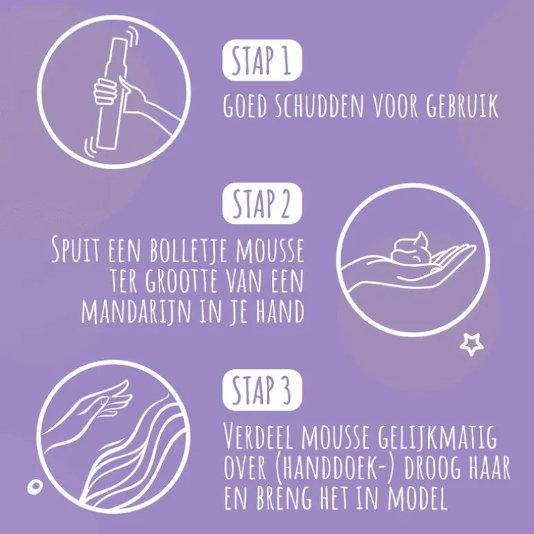 Hoe het product te gebruiken: de bus goed schudden voor gebruik. Houd de bus ondersteboven en spuit een bolletje mousse ter grootte van een mandarijn in je hand. Verdeel de mousse gelijkmatig over (handdoek-)droog haar en breng je haar in model. Föhnen versterkt het resultaat.