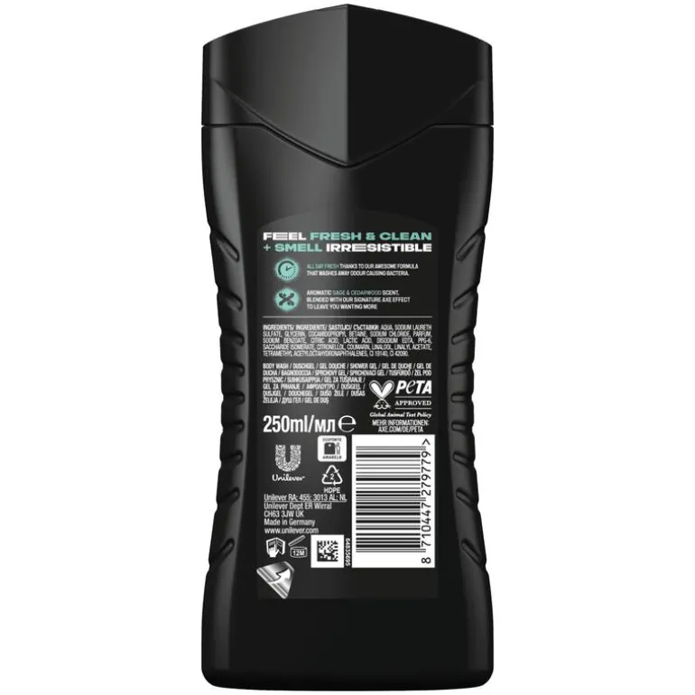 - Douchegel van AXE, verpakt in een 100% gerecyclede en recyclebare fles