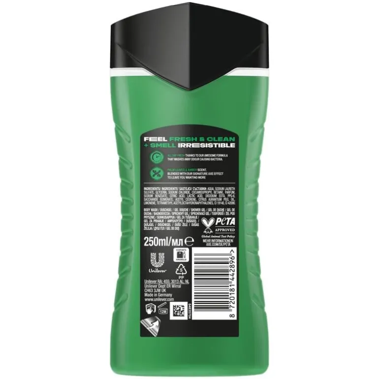 AXE Jungle Fresh 3-in-1 Douchegel met de geur van palmbladeren en amber heeft een onweerstaanbare geur. Ben je klaar voor een wild avontuur? Ontdek onze meest onweerstaanbare geur ooit: AXE Jungle Fresh 3-in-1 Douchegel. AXE Jungle Fresh 3-in1 Douchegel zorgt voor een verfrissende en relaxte verzorging en reiniging van je lichaam, gezicht en haar. De douchegel verwijdert bacteriën en laat je tot wel 12 uur lang onweerstaanbaar ruiken. AXE Jungle Fresh 3-in-1 Douchegel met toegevoegde moisturizers is dermatologisch getest en bevat 87% ingrediënten van natuurlijke oorsprong*. Met AXE-douchegel start je de dag of de avond goed. Geniet je van deze geur? Probeer dan ook eens de AXE Jungle Fresh Deodorant Bodyspray. De douchegel van Axe is verpakt in een 100% gerecyclede en recyclebare fles.