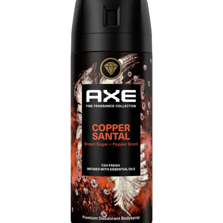 AXE Fine Fragrance Collection Copper Santal Premium Deodorant Bodyspray met de geur van sandelhout, bruine suiker en zwarte peper ruikt als een luxe parfum en beschermt effectief als een deo.